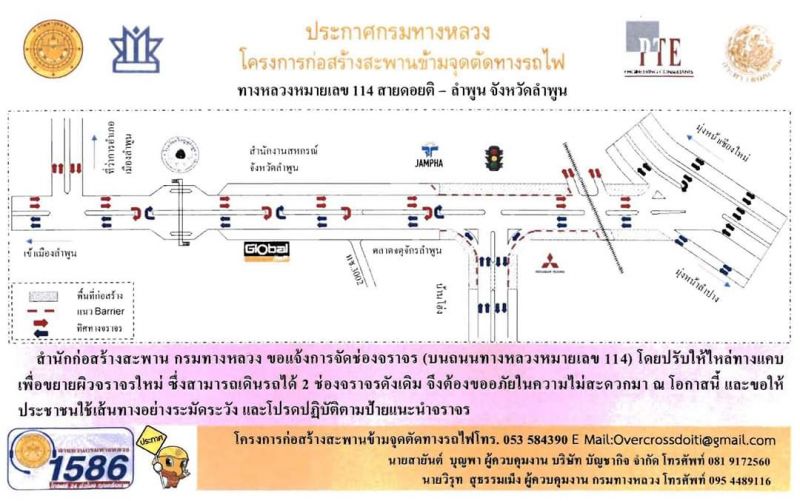 🚜🚜 #กรมทางหลวง โดย สำนักก่อสร้างสะพาน ได้จัดทำแผนการเบี่ยงจราจร โครงการก่อสร้างสะพานข้ามจุดตัดทางรถไฟ บนทางหลวงหมายเลข 114 ตอน ดอยติ-ลำพูน โดยปรับให้ไหล่ทางแคบเพื่อขยายผิวจราจรใหม่ ซึ่งสามารถเดินรถได้ 2 ช่องจราจรดังเดิม กรมทางหลวงจึงทำการเบี่ยงจราจร เพื่อลดความเสี่ยงการเกิดอุบัติเหตุและยกระดับความปลอดภัยทางถนน