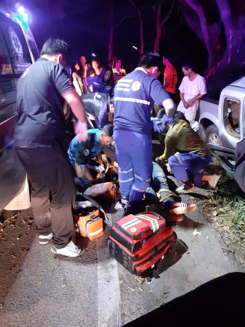 เบื้องต้นมี ผู้ได้รับบาดเจ็บชาย1ราย หมดสติปลุกไม่ตื่น เจ้าหน้าที่ได้ทำการ ปั๊มหัวใจ และเครื่องกระตุกหัวใจไฟฟ้า