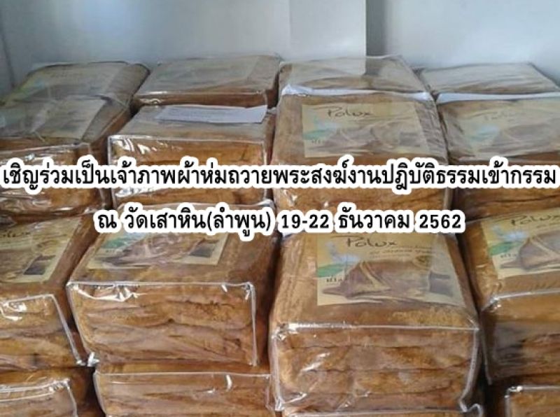 ขอเชิญร่วมเป็นเจ้าภาพผ้าห่มถวายพระสงฆ์งานปฎิบัติธรรมเข้ากรรม ในวันที่ 19-22 ธันวาคม 2562 ณ วัดเสาหิน อ.เมือง จ.ลำพูน ผืนละ 300 บาท 40ผืน
