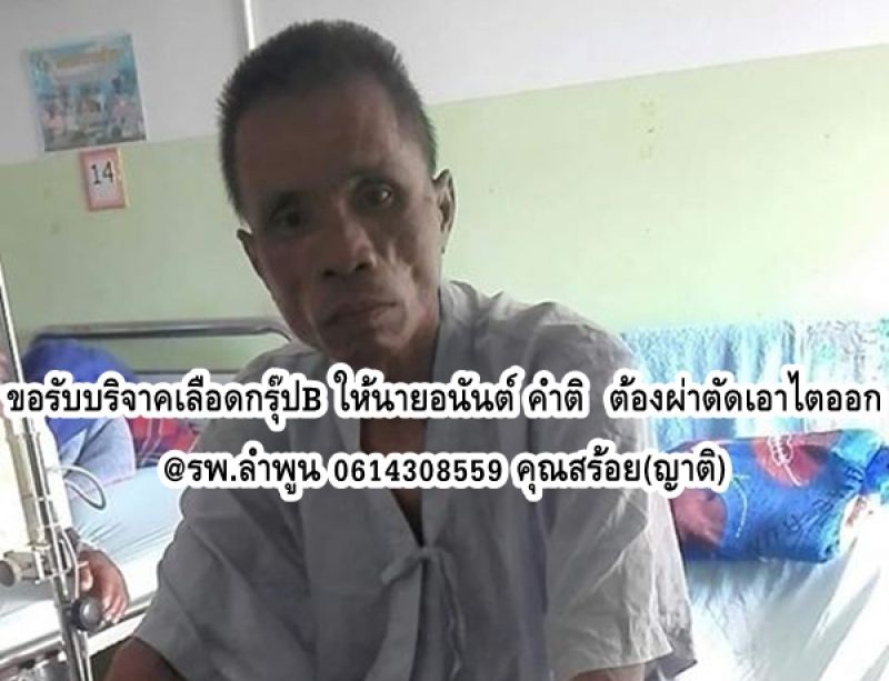 ขอรับบริจาคเลือดกรุ๊ปB ให้นายอนันต์ คำติ ต้องผ่าตัดเอาไตออก @รพ.ลำพูน 0614308559 คุณสร้อย(ญาติ)