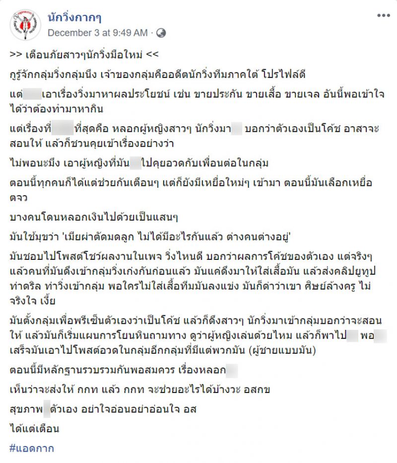 วันนี้ (5 ธ.ค.) กลายเป็นประเด็นที่นักวิ่งพากันวิจารณ์อย่างหนัก เมื่อเฟซบุ๊กเพจ นักวิ่งกากๆ ออกมาตีแผ่นักวิ่งรายหนึ่งมีพฤติกรรมหลอกผู้หญิงนักวิ่งมือใหม่ไปมีเพศสัมพันธ์ ได้โพสต์ข้อความเตือน ไว้ดังนี้