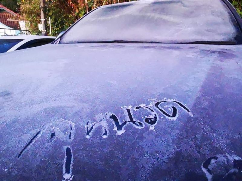 เช้านี้ 10 ธันวาคม 2562 เกิดคราบน้ำแข็งที่เกาะบนรถหลายคันที่จอดทิ้งไว้ ที่ลานจอดรถ กิ่วแม่ปานดอยอินทนนท์