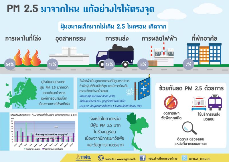 หลายสถาบันวิจัยทั้งไทยและต่างประเทศต่างวิเคราะห์ วิจัยสาเหตุของการเกิด PM2.5 ที่ส่วนใหญ่เกิดจากการเผาไหม้ ทั้งจากเครื่องยนต์ของยานพาหนะต่างๆ และการเผาวัสดุต่างๆ ข้อมูลจากกรมมลพิษ และกระทรวงพลังงาน* พบว่า สาเหตุของ PM2.5 ในประเทศไทยมาจาก ‘การเผาในที่โล่ง’ เป็นแหล่งกำเนิดของ PM2.5 มากที่สุด ตามด้วยอุตสาหกรรมการผลิต และการขนส่ง โดยภาคการผลิตไฟฟ้านั้นเป็นแหล่งกำเนิด PM2.5 ในอันดับที่ 4