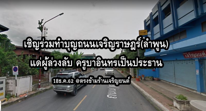 วันพุธที่18ธันวาคม 2562 เวลา 9.00-11.00น. จะมีการปิดถนน เจริญราษฎร์ ครึ่งฟากถนน บริเวณตรงข้ามร้านเจริญยนต์ เพื่อทำพิธีทำบุญถนน เพื่ออุทิศส่วนกุศลให้แก่ผู้ล่วงลับตลอดสายถนน เส้นเชียงใหม่ ลำพูน ขอเชิญผู้มีจิตศรัทธาร่วมทำบุญ และ ประกอบพิธี ในวันและเวลาดังกล่าว