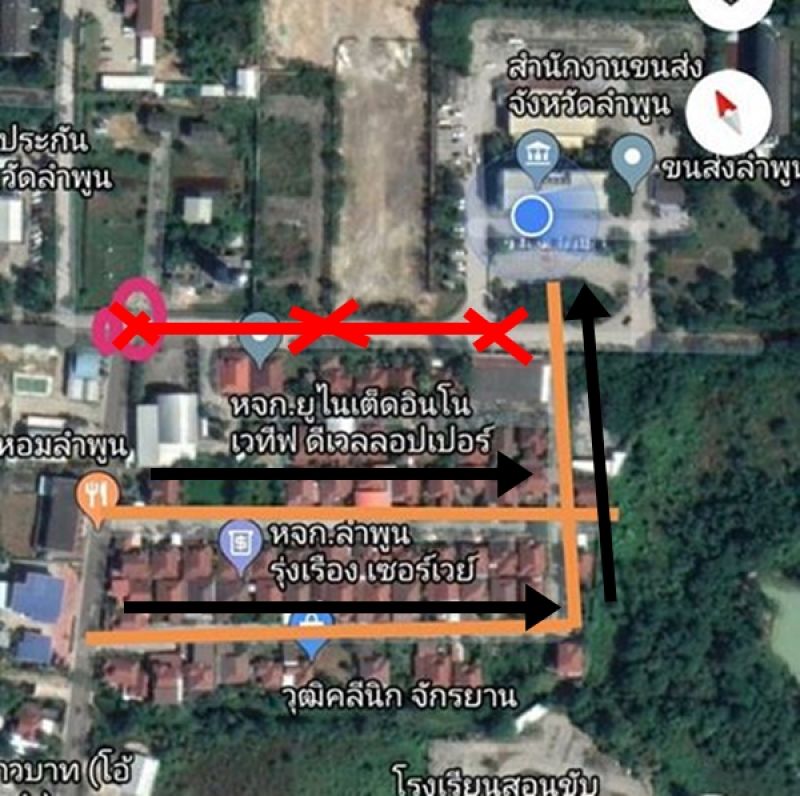 ปิดทางเข้า สำนักงานขนส่งจังหวัดลำพูน มีการก่อสร้าง ให้ใช้เส้นในหมู่บ้านลำพูนสปาแลนด์แทน