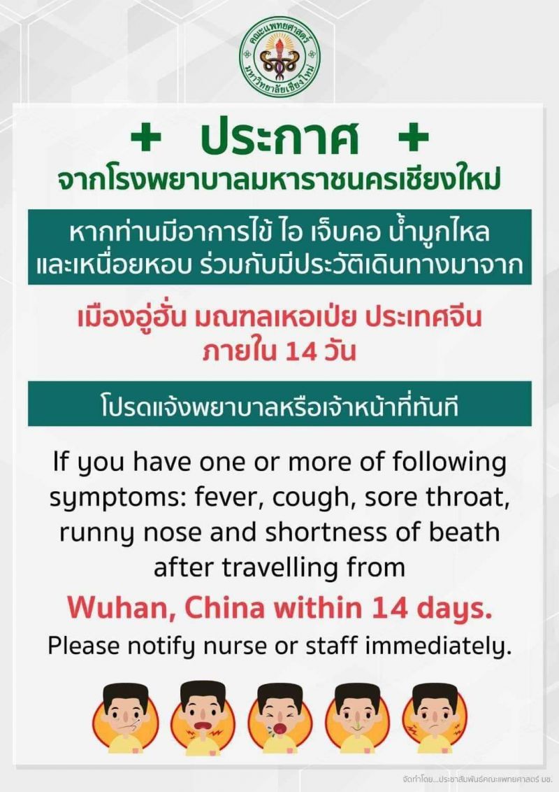 ผู้ที่เดินทางมาจากเมืองอู่ฮั่น มณฑลเหอเป่ย ประเทศสาธารณรัฐประชาชนจีน ในช่วงนี้ รวมถึงหากพบเห็นผู้ที่เดินทางมาจากเมืองดังกล่าว แล้วมีอาการไข้ ไอ เจ็บคอ น้ำมูกไหล และเหนื่อยหอบ ขอให้รีบไปพบแพทย์ หรือแจ้งโรงพยาบาลใกล้บ้านหรือที่พักทันที