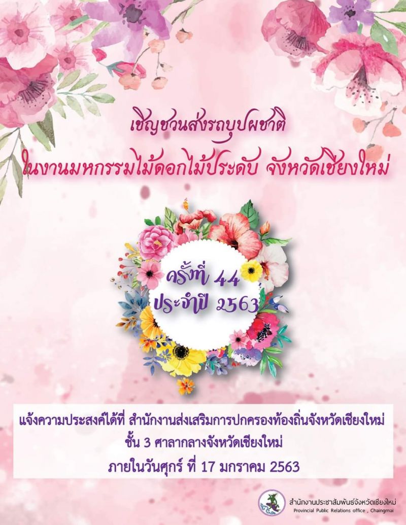 จังหวัดเชียงใหม่ ขอเชิญหน่วยงานภาครัฐ ภาคเอกชน มูลนิธิ ชมรม สมาคม อำเภอ องค์กรปกครองส่วนท้องถิ่น และภาคเอกชนที่สนใจ ส่งรถบุปผชาติเข้าร่วมงานมหกรรมไม้ดอกไม้ประดับ จังหวัดเชียงใหม่ ครั้งที่ 44 ประจำปี 2563 โดยสามารถแจ้งความประสงค์ได้ที่สำนักงานส่งเสริมการปกครองท้องถิ่นจังหวัดเชียงใหม่ ชั้น 3 ศาลากลางจังหวัดเชียงใหม่ หมายเลขโทรศัพท์ 0-5311-2637 ภายในวันที่ 17 มกราคม นี้