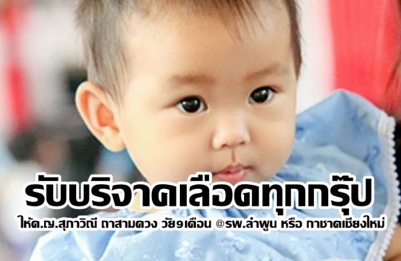 | • รับบริจาคเลือดทุกกรุ๊ป ให้ด.ญ.สุภาวิณี ถาสามดวง วัย9เดือน @รพ.ลำพูนหรือกาชาดเชียงใหม่ |