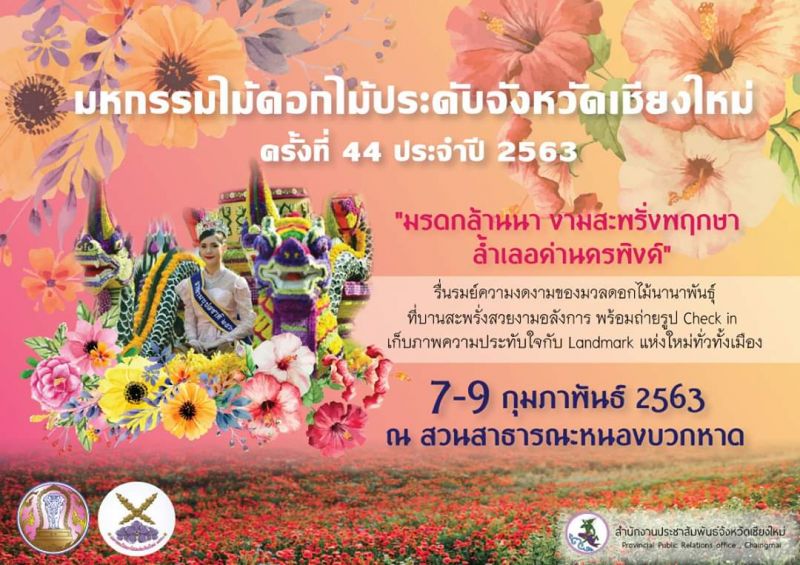 จังหวัดเชียงใหม่ ขอเชิญชวนเที่ยวงานมหกรรมไม้ดอกไม้ประดับจังหวัดเชียงใหม่ ครั้งที่ 44 ประจำปี 2563 ระหว่างวันที่ 7 - 9 กุมภาพันธ์ 2563 ณ สวนสาธารณะหนองบวกหาด และข่วงประตูท่าแพ