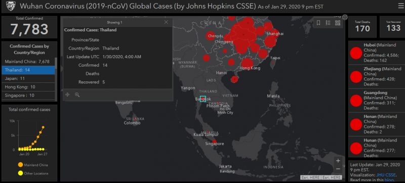 ข้อมูลล่าสุดในเวลา 13.00 น. วันพฤหัสบดีที่ 30 ม.ค. 2563 จำนวนผู้ติดเชื้อโคโรน่าสายพันธ์ุใหม่ทั้งหมดอยู่ที่ 7,783 ราย แบ่งเป็นในจีนแผ่นดินใหญ่ 7,678 ราย, ฮ่องกง 10 ราย, มาเก๊า 7 ราย, ไต้หวัน 8 ราย, ที่อื่นๆ ในเอเชีย 43 ราย, ยุโรป 8 ราย, อเมริกาเหนือ 8 ราย, ออสเตรเลีย 5 ราย และที่อื่นๆ อีก 4 ราย ส่วนจำนวนผู้เสียชีวิตเพิ่มเป็น 170 คน ทั้งหมดอยู่ในจีนแผ่นดินใหญ่ ในประเทศจีนมีเพียงภูมิภาคเดียวที่ยังไม่มีรายงานว่าพบผู้ติดเชื้อไวรัสโคโรน่า คือในเขตปกครองตนเองทิเบต
