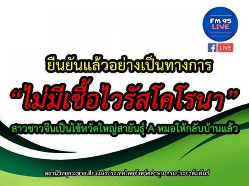| • ผู้ว่าฯลำพูน แจ้งสาวจีน ผู้ป่วยเสี่ยงอู่ฮั่น ส่งจากเชียงใหม่ ไม่ติดเชื้อ 100% |
