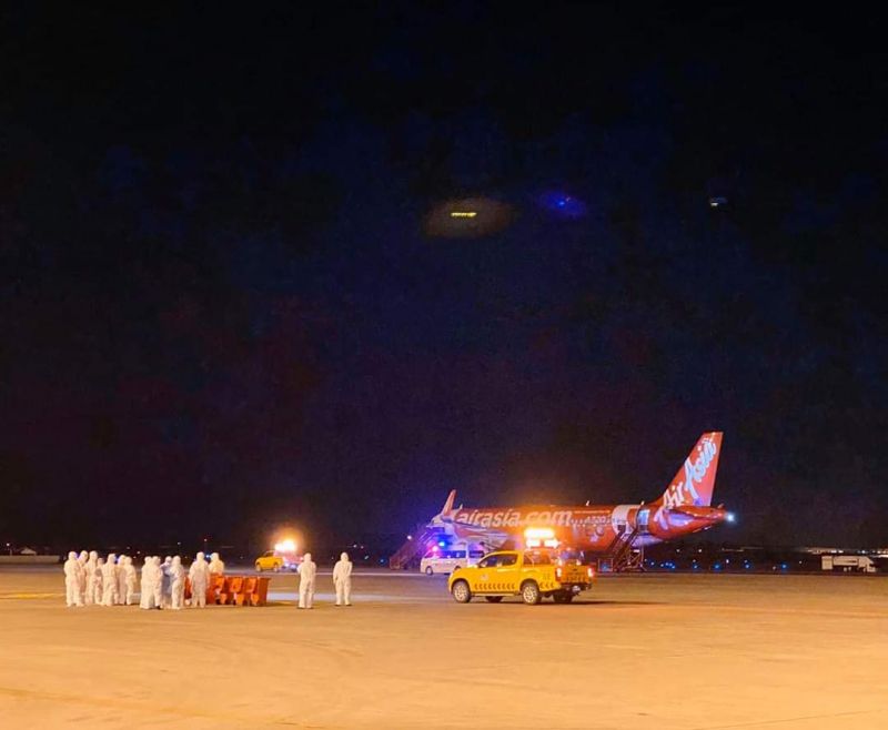 🛬 ทยอยลงจากเครื่องบิน โดยมีเจ้าหน้าที่ สวมชุดป้องกันตามมาตรฐานองค์การอนามัยโลก ใช้เครื่องเทอร์โมสแกน ตรวจคัดกรอง ก่อนลง จากเครื่อง