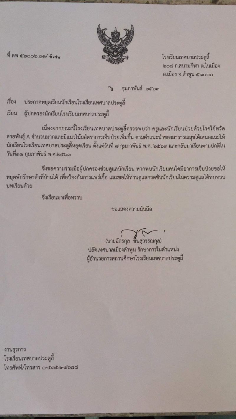 เมื่อวันที่ 7 กุมภาพันธ์ 2563 โรงเรียนประตูลี้จังหวัดลำพูน ได้ทำการแจ้งผู้ปกครองและผู้ที่เกี่ยวข้อง ขออนุญาตหยุดเรียน 1 วัน ในวันที่ 7 กุมภาพันธ์ 2563 มันจะมีนักเรียน จํานวนหนึ่ง เป็นไข้หวัดใหญ่สายพันธุ์ A เพื่อความปลอดภัยของนักเรียนและเป็นการป้องกันไม่ให้แพร่ระบาด ทางโรงเรียนจึงขออนุญาตหยุดเรียนในวันศุกร์ที่ 7 กุมภาพันธ์ 2563 เป็นเวลา 1 วัน เพื่อทำความสะอาดโรงเรียน ดูจบเปิดโรงเรียนใน วันอังคารที่ 11 กุมภาพันธ์ 2563 เนื่องจากวันเสาร์อาทิตย์และจันทร์เป็นวันหยุด