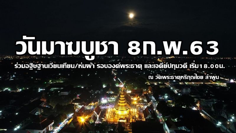 วันมาฆบูชา 8ก.พ.63 ร่วมเวียนเทียนรอบองค์พระธาตุหริภุญชัยลำพูน เริ่ม18.00น.