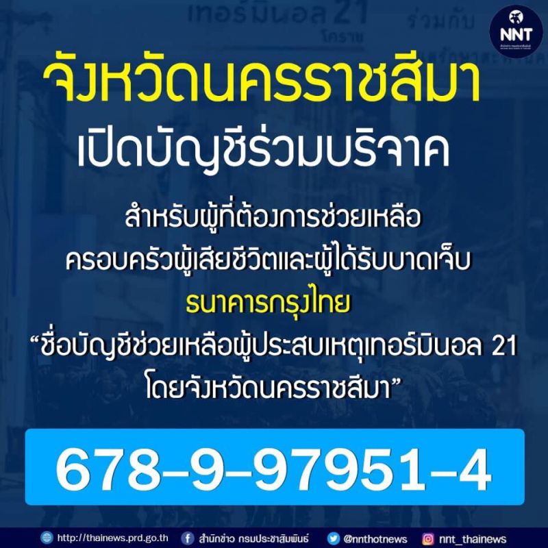 ธนาคารกรุงไทย ชื่อบัญชี ช่วยเหลือผู้ประสบเหตุเทอร์มินอล 21 โดยจังหวัดนครราชสีมา เลขที่บัญชี 678-9-97951-4