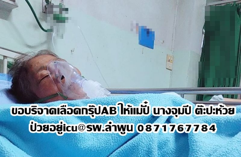 ขณะนี้เข้ารับการรักษาอยู่ที่ตึกICU1รพ.ลำพูน ซึ่งตอนนี้ได้มีอาการปอดติดเชื้อและร่วมด้วยติดเชื้อในกระแสเลือด และมีภาวะแทรกซ้อนตามมา ทางรพ.แจ้งว่าต้องได้รับการผ่าตัดและต้องใช้เลือด แต่เลือดกรุ๊ปABของทางรพ.หมด จึงขอความเห็นใจจากเพื่อนๆพี่ๆน้องทุกคนร่วมบริจาคเลือดให้แม่ปี๋ นางจุมปี ต๊ะปะห้วย ได้ที่รพ.ลำพูนได้