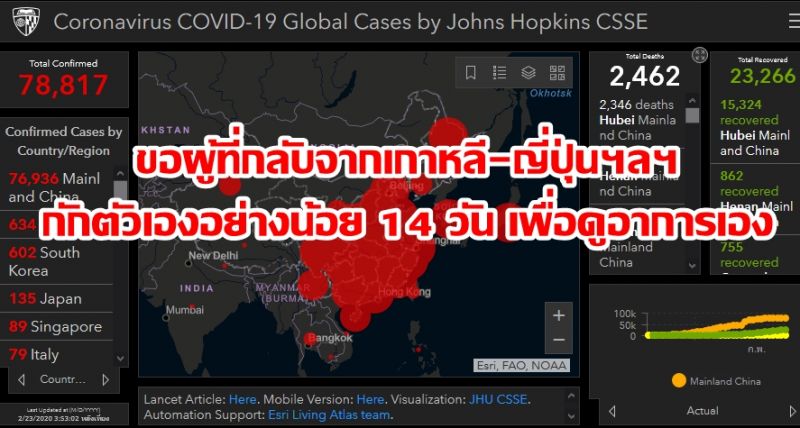 23 ก.พ. นพ.สุขุม กาญจนพิมาย ปลัดกระทรวงสาธารณสุข และคณะ แถลงข่าวสถานการณ์โรคติดเชื้อไวรัสโคโรนา 2019 หรือ โควิด-19 ว่า ขณะนี้องค์การอนามัยโลก (WHO) ยังไม่มีคำแนะนำห้ามการเดินทางไปยังประเทศที่มีการระบาด ตลอดจนยังไม่มีการกำหนดเป็นมาตรการที่จำเพาะสำหรับผู้เดินทางระหว่างประเทศ