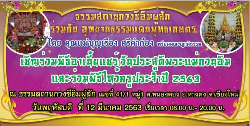 ธรรมสถานกวงซีอิมผู่สัก ร่วมกับ อุทยานแดนพุทธเกษตร โดย คุณแม่ บุญเรือง ศรีคำก๋อง พร้อมคณะญาติธรรม เชิญร่วมพิธีอาเนี้ยแชร์(วันประสูติพระโพธิสัตว์กวนอิมและร่วมพิธีไหว้ครูประจำปี 2563 ) ณ.ธรรมสถานกวงซีอิมผู่สัก เลขที่ 41/1 หมู่1 ต.หนองตอง อ.หางดง จ.เชียงใหม่