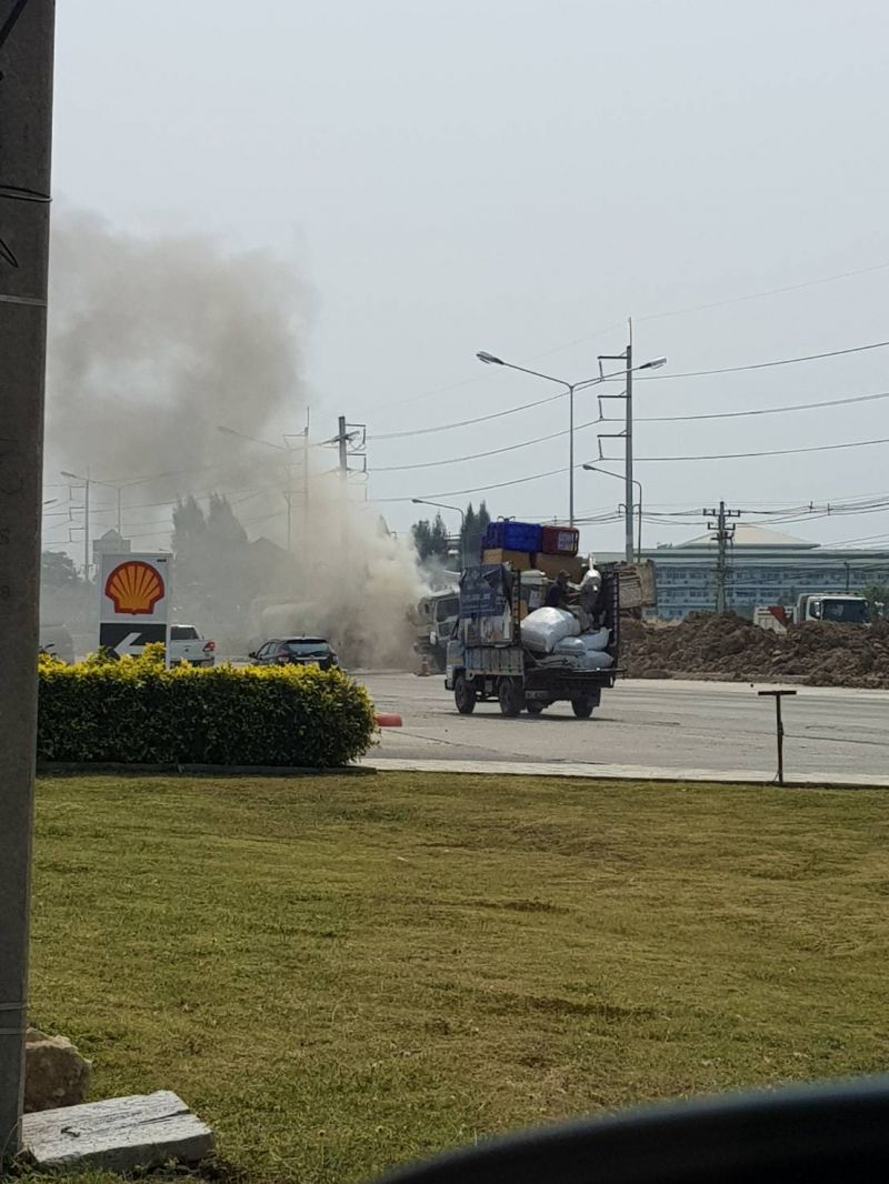 รถพ่วงขนดิน ขำกองดิน ควันลุกจุ้งจุ้ง โชคดี จนท. ดับได้ทัน หน้าบุญถาวรเชียงใหม่