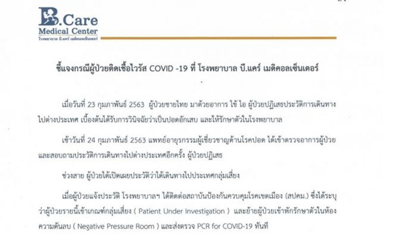 วันที่ 26 ก.พ.63 แฟนเพจ โรงพยาบาล บี.แคร์ เมดิคอลเซ็นเตอร์ เผยแพร่ประกาศชี้แจงกรณีผู้ป่วยติดเชื้อไวรัสโคโรนา หรือ โควิด-19 (COVID-19) ที่โรงพยาบาล บี.แคร์ เมดิคอลเซ็นเตอร์ โดยระบุว่า