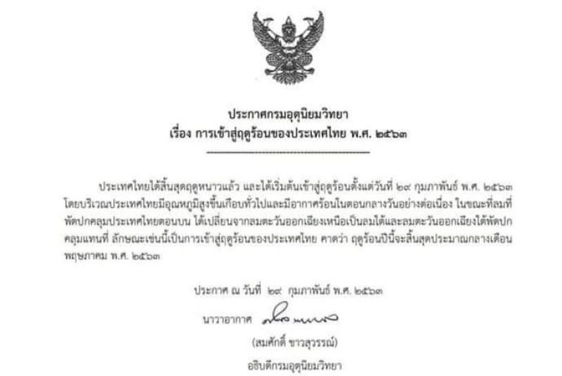 ประเทศไทยได้สิ้นสุดฤดูหนาแล้ว และได้เริ่มเข้าสู่ฤดูร้อน ตั้งแต่วันที่ 29 กุมภาพันธ์ 2563 และคาดว่าจะสิ้นสุดประมาณกลางเดือน พฤษภาคม 2563
