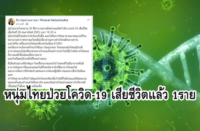 วันนี่ เมื่อเวลาประมาณ 11.00น. เฟสบุ๊ค ศาสตราจารย์ นายแพทย์ ธีระวัฒน์ เหมะจุฑา ศาสตราจารย์สาขาประสาทวิทยา ภาควิชาอายุรศาสตร์ คณะแพทยศาสตร์ จุฬาลงกรณ์มหาวิทยาลัย ผู้อำนวยการศูนย์ปฏิบัติการโรคทางสมอง โรงพยาบาลจุฬาลงกรณ์ หัวหน้าศูนย์วิทยาศาสตร์สุขภาพโรคอุบัติใหม่ คณะแพทยศาสตร์ โรงพยาบาลจุฬาลงกรณ์ สภากาชาดไทย ได้โพสต์ ข้อความแจ้งว่า ผู้ป่วยชายไทย ที่ติดเชื้อ โควิด-19 ได้เสียชีวิตลงแล้ว เป็นหนุ่มอายุ35ปี ทำงานเป็น พนักงานขาย ไม่มีโรคประจำตัว ได้รับการรักษาตามมาตรฐานที่โรงพยาบาลบำราศนราดูลโดยมีผู้เชี่ยวชาญทางด้านวิกฤติหลายท่าน และได้รับ เครื่องช่วยให้ออกซิเจนในเลือด ECMO