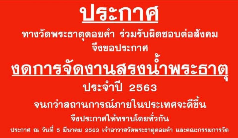 วัดพระธาตุดอยคำ ต.แม่เหียะ อ.เมือง จ.เชียงใหม่ ได้ออกประกาศกรณีมีการแพร่ระบาดของไวรัสโควิด-19 จึงร่วมรับผิดชอบต่อสังคม ขอประกาศ งดจัดงานสรงน้ำพระธาตุ ประจำปี 2563 จนกว่าสถานการณ์ภายในประเทศจะดีขึ้น จึงประกาศให้ทราบโดยทั่วกัน ประกาศ ณ วันที่ 5 มีนาคม 2563เจ้าอาวาสวัดพระธาตุดอยคำ และคณะกรรมการวัด”