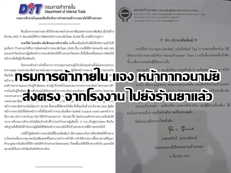 จากกรณีวันที่ 8 มี.ค. สมาคมร้านขายยา ออกจดหมายข่าวลงนามโดย นายเทพรักษ์ สุรทานต์นนท์ ประธานที่ปรึกษาสมาคมฯ ว่า ยังไม่ได้รับการจัดสรรหน้ากากอนามัยวันละ 25,000 ชิ้น ตามที่กรมการค้าภายในออกข่าวตามสื่อต่างๆ นั้น