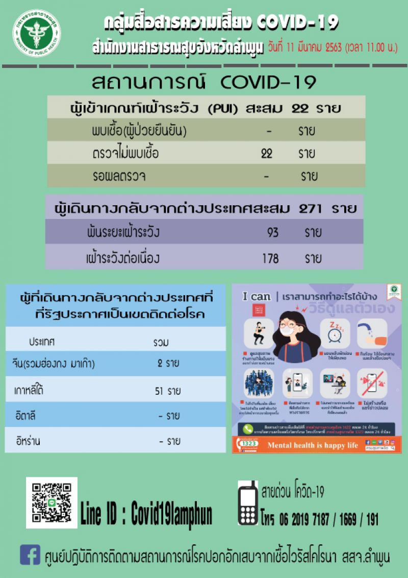 11มีนา63 ลำพูน ไม่มีผู้ติดเชื้อโควิด-19 ,ไม่มีผู้ป่วยเฝ้าระวัง ,มาเกาหลี+จีน53 ,อื่นๆ218
