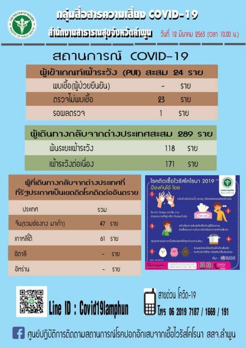 รายงานสถานการณ์ ไวรัส โควิด-19 ของจังหวัดลำพูน ประจำวันที่ 12 มีนาคม 2563 เวลา 10:00 น.