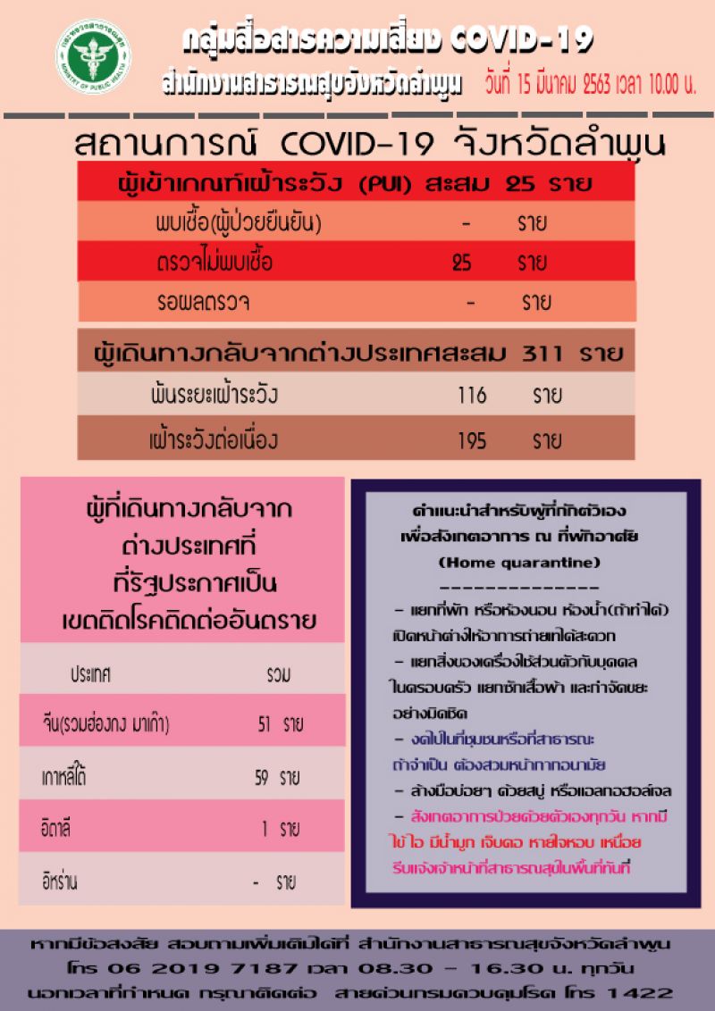 รายงานสถานการณ์ ไวรัส โควิด-19 ของจังหวัดลำพูน ประจำวันที่ 15 มีนาคม 2563 เวลา 10:00 น.