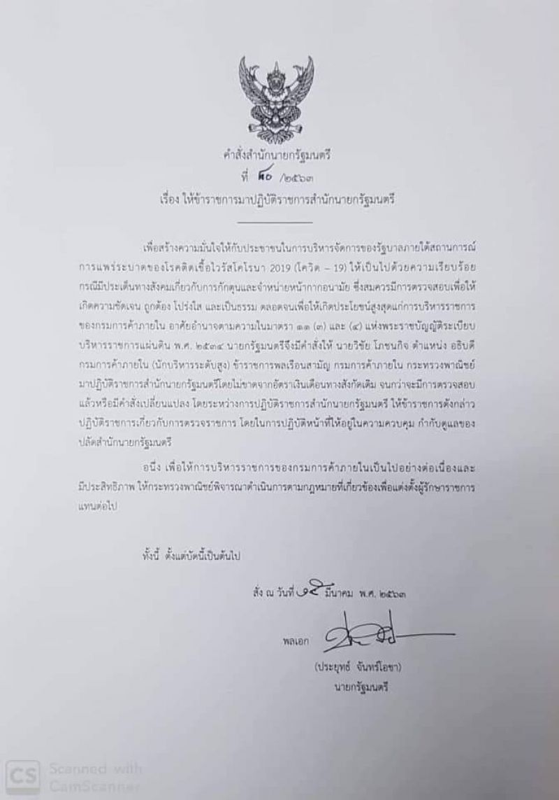วันนี้ พลเอกประยุทธ์ จันทร์โอชา นายกรัฐมนตรีมีคำสั่งให้นายวิชัย โภชนกิจ อธิบดีกรมการค้าภายในกระทรวงพาณิชย์ มาปฏิบัติราชการที่สำนักนายกรัฐมนตรี โดยไม่ขาดจากอัตราเงินเดือนในสังกัดเดิม จนกว่าจะมีการตรวจสอบกรณีกรณีการกักตุนและจำหน่ายหน้ากากอนามัยเพื่อสร้างความมั่นใจให้กับประชาชนในการบริหารจัดการของรัฐบาล ภายใต้สถานการณ์การแพร่ระบาดของโรคโควิด-19 โดยระหว่างการปฎิบัติราชการที่สำนักนายกรัฐมนตรี ให้นายวิชัย ปฏิบัติราชการเกี่ยวกับการตรวจราชการโดยอยู่ในความควบคุมและกำกับดูแลของปลัดประจำสำนักนายกรัฐมนตรี ซึ่งหลังจากนี้มอบหมายให้กระทรวงพาณิชย์แต่งตั้งผู้รักษาราชการแทนเพื่อให้การบริหารราชการของกรมการค้าภายในเป็นไปอย่างต่อเนื่องและมีประสิทธิภาพต่อไป