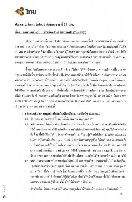 16 มีนาคม 2563 ผู้สื่อข่าวรายงานว่า บริษัท การบินไทย จำกัด (มหาชน) มีประกาศฉบับที่ 041/2563 เรื่องการลาหยุดโดยไม่รับเงินเดือนด้วยความสมัครใจ (CODE 8501) โดยมีใจความว่า จากการเหตุการณ์โรค COVID-19 มีการแพร่ระบาดไปทั่วโลก ทำให้ประเทศจำนวนมากต่างออกมาตรการเข้มขวดการเดินทาง และการขนส่งผู้โดยสารจากประเทศที่มีการแพร่ระบาดอยู่ จนส่งผลกระทบต่อปริมาณของผู้โดยสารของบริษัทที่ลดลงอย่างมาก จนเข้าขั้นวิกฤต