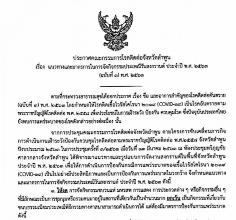 ผู้ว่าจังหวัดลำพูน ลงนาม ในประกาศคณะกรรมการโรคติดต่อจังหวัดลำพูน  เรื่อง แนวทางและมาตราการในการจัดกิจกรรมวันสงกรานต์ ประจำปี พ.ศ.2563