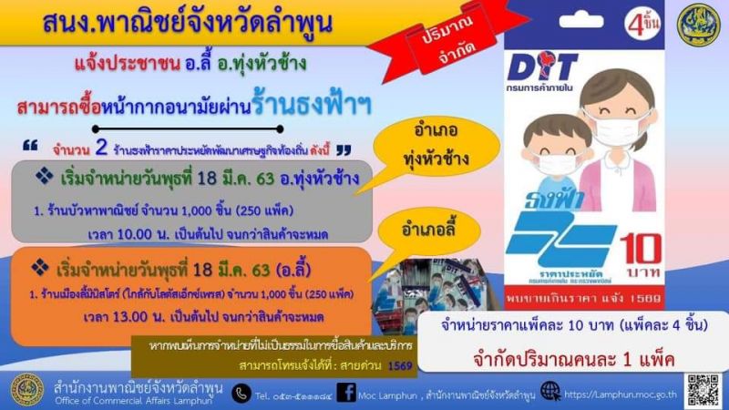 แจ้งประกาศประชาสัมพันธ์ ประชาชนอำเภอทุ่งหัวช้าง และอำเภอลี้ สามารถซื้อหน้ากากอนามัย ผ่านร้านค้าธงฟ้าราคาประหยัดพัฒนาเศรษฐกิจท้องถิ่น จำนวน 2 แห่ง ได้ในวันที่18 มีนาคม 2563 ดังนี้