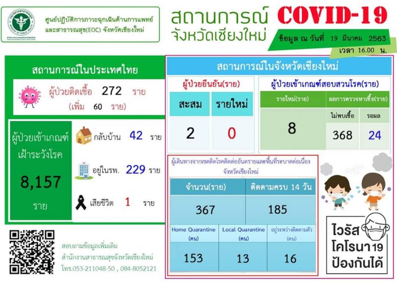 สถานการณ์โควิด 19 ของจังหวัดเชียงใหม่ประจำวันที่ 19 มีนาคม 2563 .