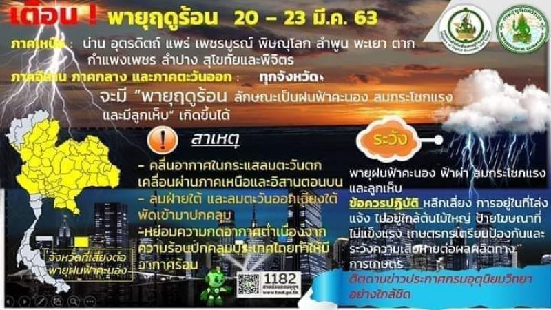 ในช่วงวันที่ 20-23 มีนาคม 2563 ประเทศไทยตอนบนจะมีพายุฤดูร้อนเกิดขึ้น โดยมีลักษณะของพายุฝนฟ้าคะนอง ลมกระโชกแรง กับมีลูกเห็บตกบางพื้นที่ รวมถึงอาจมีฟ้าผ่าเกิดขึ้นได้ ขอให้ประชาชนบริเวณ