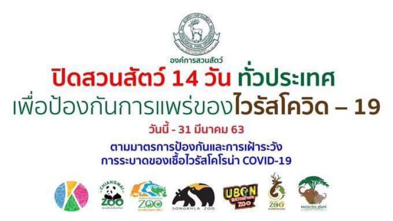 องค์การสวนสัตว์ ปิดสวนสัตว์ทั่วประเทศ 14 วัน ตั้งแต่วันนี้ ถึง 31 มีนาคม 2563 ตามมติคณะรัฐมนตรีมีมติ ให้กิจการและสถานที่บริการที่มีการรวมคนจำนวนมาก ปิดให้บริการชั่วคราว เพื่อลดการแพร่ระบาดไวรัสโควิด 19