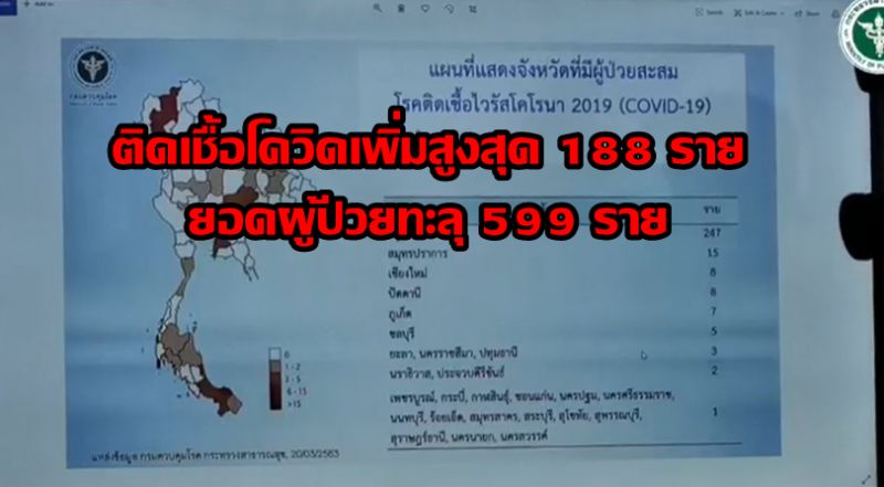 | • ติดเชื้อโควิดเพิ่มสูงสุุด 188 ราย ยอดผู้ป่วยทะลุ 599 ราย - 22มีนา63 |