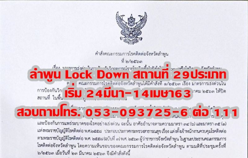 | • ลำพูน Lock Down สถานที่ 29ประเภท เริ่ม 24มีนา-14เมษา63 สอบถามโทร.053-093725-6 ต่อ 111 |