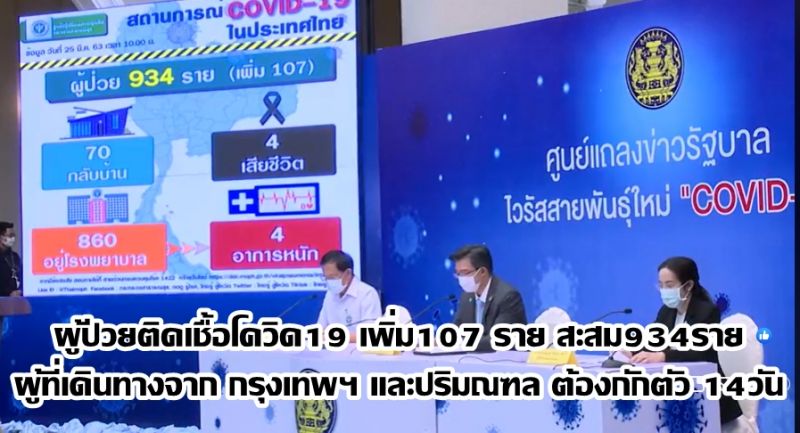 ผู้ป่วยติดเชื้อโควิด19 เพิ่ม107 ราย สะสม934ราย(25มีนา63)