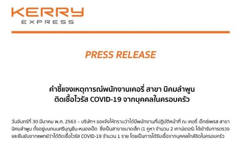 บริษัทฯ ขอแจ้งให้ทราบว่าได้มีพนักงานที่ปฏิบัติหน้าที่ ณ เคอรี่ เอ็กซ์เพรส สาขานิคมลำพูน ตั้งอยู่บนถนนศรีบุญยืน-หนองเป็ด ซึ่งเป็นสาขาขนาดเล็ก (1 คูหา จำนวน 2 เคาน์เตอร์) ได้เข้ารับการตรวจและยืนยันจากแพทย์ว่าได้ติดเชื้อไวรัส COVID-19 จำนวน 1 ราย โดยเป็นการได้รับเชื้อจากบุคคลใกล้ชิดในครอบครัว