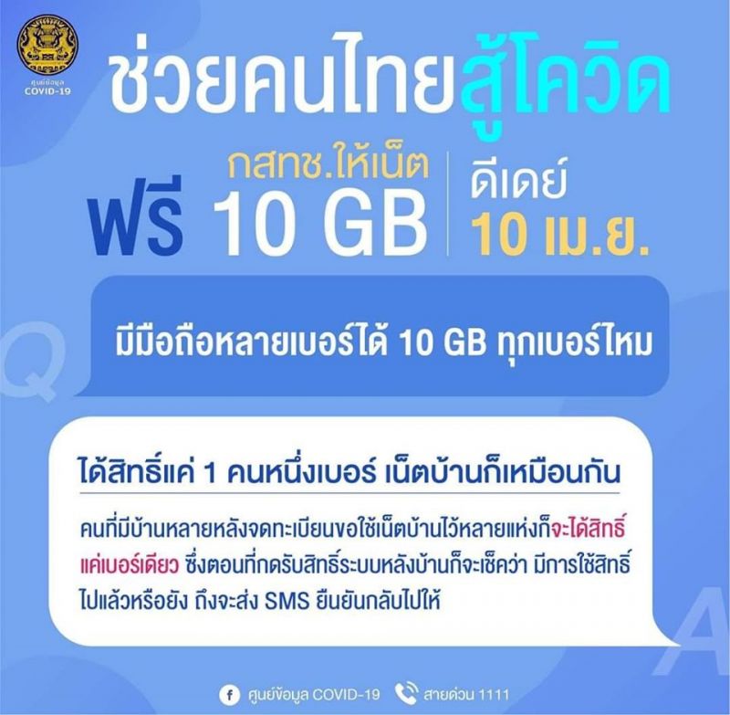 ‼️กสทช.ช่วยเหลือประชาชนในช่วงวิกฤตโควิด-19 ให้ใช้งานเน็ตมือถือเพิ่มฟรี คนละ 10 GB ส่วนเน็ตบ้านอัพความเร็วเป็น 100 Mbps พร้อมเสนอ ครม. ออกเป็นมาตรการเร่งด่วน