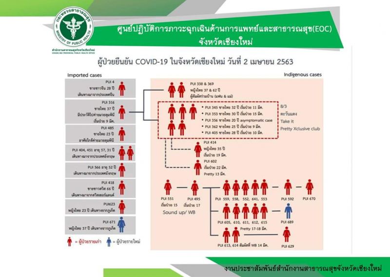 ทั้งนี้ จังหวัดเชียงใหม่มีผู้ป่วยเข้าเกณฑ์เฝ้าระวังโรค จำนวน 687 ราย ตรวจแล้วไม่พบเชื้อและกลับบ้านแล้ว 635 ราย อยู่สังเกตอาการในโรงพยาบาล 52 ราย สำหรับยอดผู้ป่วยยืนยันสะสม 36 ราย มาจากกลุ่มที่เดินทางกลับมาจากพื้นที่ระบาด 9 ราย กลุ่มผู้สัมผัสร่วมบ้านผู้ป่วยยืนยัน 3 ราย และกลุ่มมีประวัติเกี่ยวข้องกับสถานบันเทิงในจังหวัดเชียงใหม่ 24 ราย