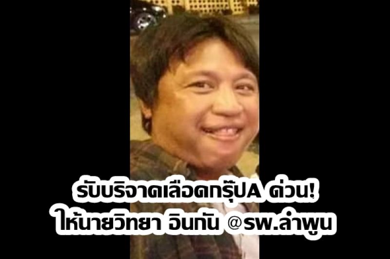 รับบริจาคเลือดกรุ๊ปA ด่วน! ให้นายวิทยา อินกัน @รพ.ลำพูน