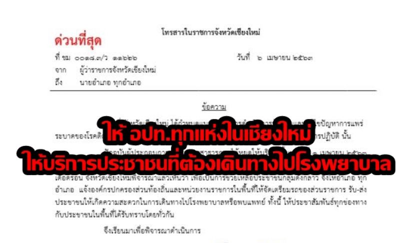 วันนี้ (6 เม.ย. 63) นายเจริญฤทธิ์ สงวนสัตย์ ผู้ว่าราชการจังหวัดเชียงใหม่ มีหนังสือด่วนที่สุดถึงนายอำเภอทั้ง 25 อำเภอ กำหนดแนวทางในการดำเนินการป้องกันและแก้ไขปัญหาการแพร่ระบาดของโรคติดเชื้อไวรัสโคโรน่า 2019 หรือ โควิด-19 ให้ทุกอำเภอถือเป็นแนวทางในการปฏิบัติ เนื่องจากปัจจุบันผู้ประกอบการรถโดยสารสาธารณะได้หยุดให้บริการ ตั้งแต่วันที่ 1 เมษายน 2563 ทำให้ประชาชนที่มีความจำเป็นจะต้องเดินทางไปรักษาตัว หรือพบแพทย์ยังโรงพยาบาลต่างๆ ได้รับความเดือดร้อน ดังนั้น เพื่อเป็นการช่วยเหลือประชาชนกลุ่มดังกล่าว ให้อำเภอทุกอำเภอแจ้งองค์กรปกครองส่วนท้องถิ่น และหน่วยงานราชการในพื้นที่จัดเตรียมรถของส่วนราชการ ในการรับ-ส่งประชาชนในการเดินทางไปโรงพยาบาลหรือพบแพทย์