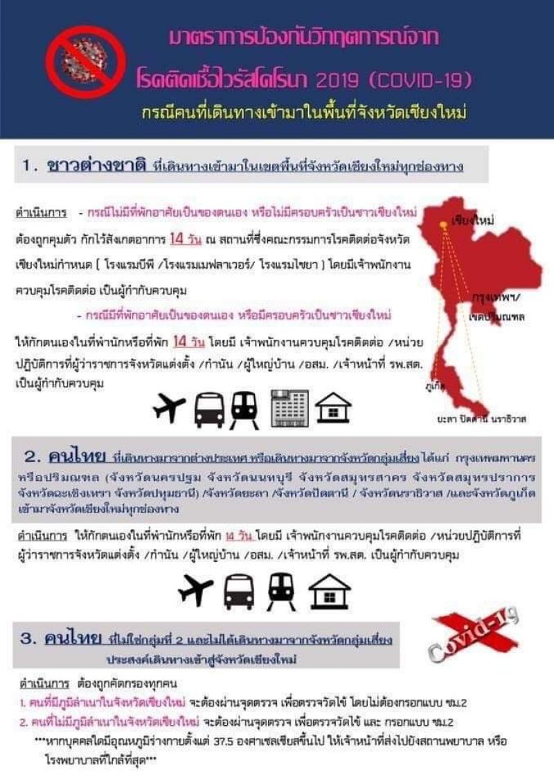4. คนไทยที่มีภูมิลำเนาในจังหวัดเชียงใหม่ ก็ต้องถูกตรวจสอบวัดอุณหภูมิร่างกาย หากเกิน 37.5 องศาเซลเซียส จะต้องถูกนำส่งสถานพยาบาลเพื่อตรวจสอบ หากอุณหภูมิปกติ ก็สามารถเดินทางกลับภูมิลำเนาของตนได้