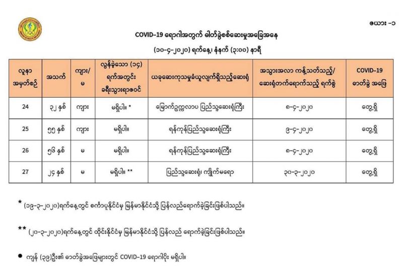 เคส 26 หญิง อายุ 56 ปี เขต Hlaing Tharyar ไม่พบประวัติการเดินทางในช่วง 14 วันที่ผ่านมา เริ่มมีอาการป่วย 1 เมษา แอดมิท 8 เมษา ที่ Yangon General Hospital มีประวัติความดันสูงและเบาหวานร่วมด้วย