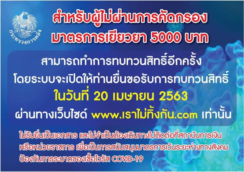 ขอเน้นย้ำว่าประชาชนไม่จำเป็นต้องเดินทางมาที่กระทรวงการคลัง เพราะไม่ได้มีช่องทางการเปิดรับเอกสาร และเป็นการดำเนินการตามแนวทางเว้นระยะห่างทางสังคม เพื่อลดความเสี่ยงต่อการแพร่ระบาดของไวรัส Covid-19 ทั้งต่อตัวผู้ประสงค์จะขอทบทวนสิทธิ์เองและต่อส่วนรวมของสังคมไทย