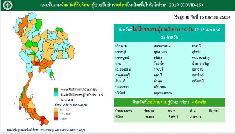 จากรายงานผู้ป่วยติดเชื้อไวรัสโรนา 2019 ในช่วง 14 วันที่ผ่านมา (วันที่ 3 -16 เมษายน 2563) มี 27 จังหวัด ที่ยังไม่มีรายงานผู้ป่วยรายใหม่ คือ เชียงราย, เพชรบุรี, เพชรบูรณ์, แพร่, แม่ฮ่องสอน, กาญจนบุรี, กาฬสินธุ์, จันทบุรี, นครนายก, บุรีรัมย์, มหาสารคาม, มุกดาหาร, ยโสธร, ร้อยเอ็ด, ราชบุรี, ลพบุรี, ลำพูน, ศรีสะเกษ, สมุทรสงคราม, สระบุรี, สุโขทัย, หนองคาย, หนองบัวลำภู, อำนาจเจริญ, อุดรธานี, อุตรดิตถ์ และอุทัยธานี